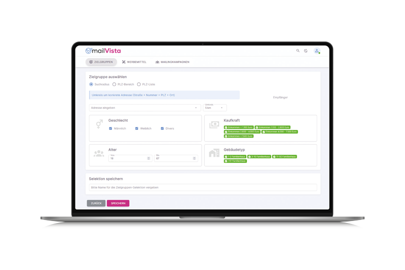 mailVista ist das revolutionäre Tool der QUADRESS GmbH, mit dem Du ganz einfach neue B2C-Kontakte auswählen kannst. Mit neuster KI-Technologie helfen wir Dir, diese potenziellen Neukunden oder auch Deine Bestandskunden mit wenigen Klicks zu kontaktieren.